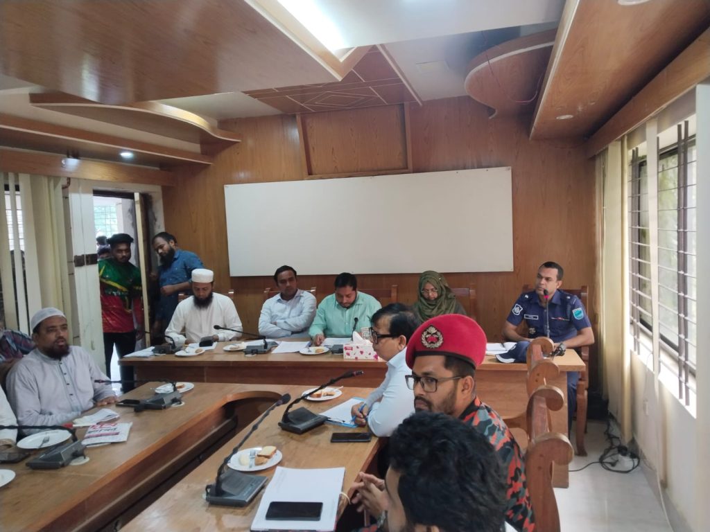 উপজেলা নির্বাহী কর্মকর্তা মোঃ কামরুল হাসান মারুফ-এর সভাপতিত্বে অনুষ্ঠিত এ সভায় উপজেলা প্রশাসনের বিভিন্ন পর্যায়ের কর্মকর্তা, রাজনৈতিক দলের নেতৃবৃন্দ, সদর উপজেলার ৬১টি পূজা মণ্ডপের সভাপতি ও সাধারণ সম্পাদকবৃন্দ উপস্থিত ছিলেন।