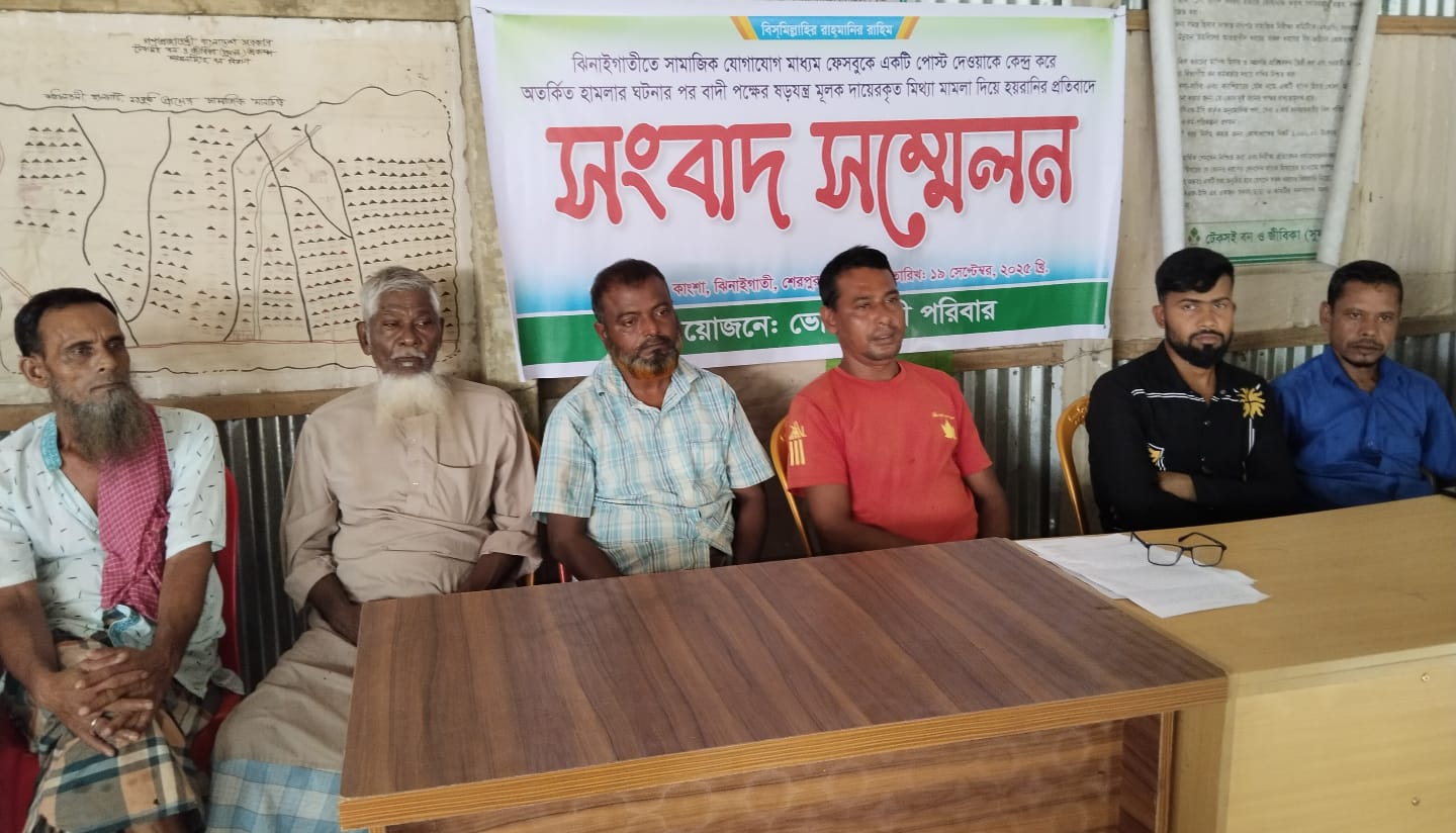 শেরপুরের ঝিনাইগাতীতে সামাজিক যোগাযোগ মাধ্যম ফেসবুকে একটি পোস্টকে কেন্দ্র করে সংঘটিত হামলার পর ষড়যন্ত্রমূলকভাবে দায়ের করা মামলায় হয়রানির প্রতিবাদে সংবাদ সম্মেলন করেছে ভুক্তভোগী পরিবার।
