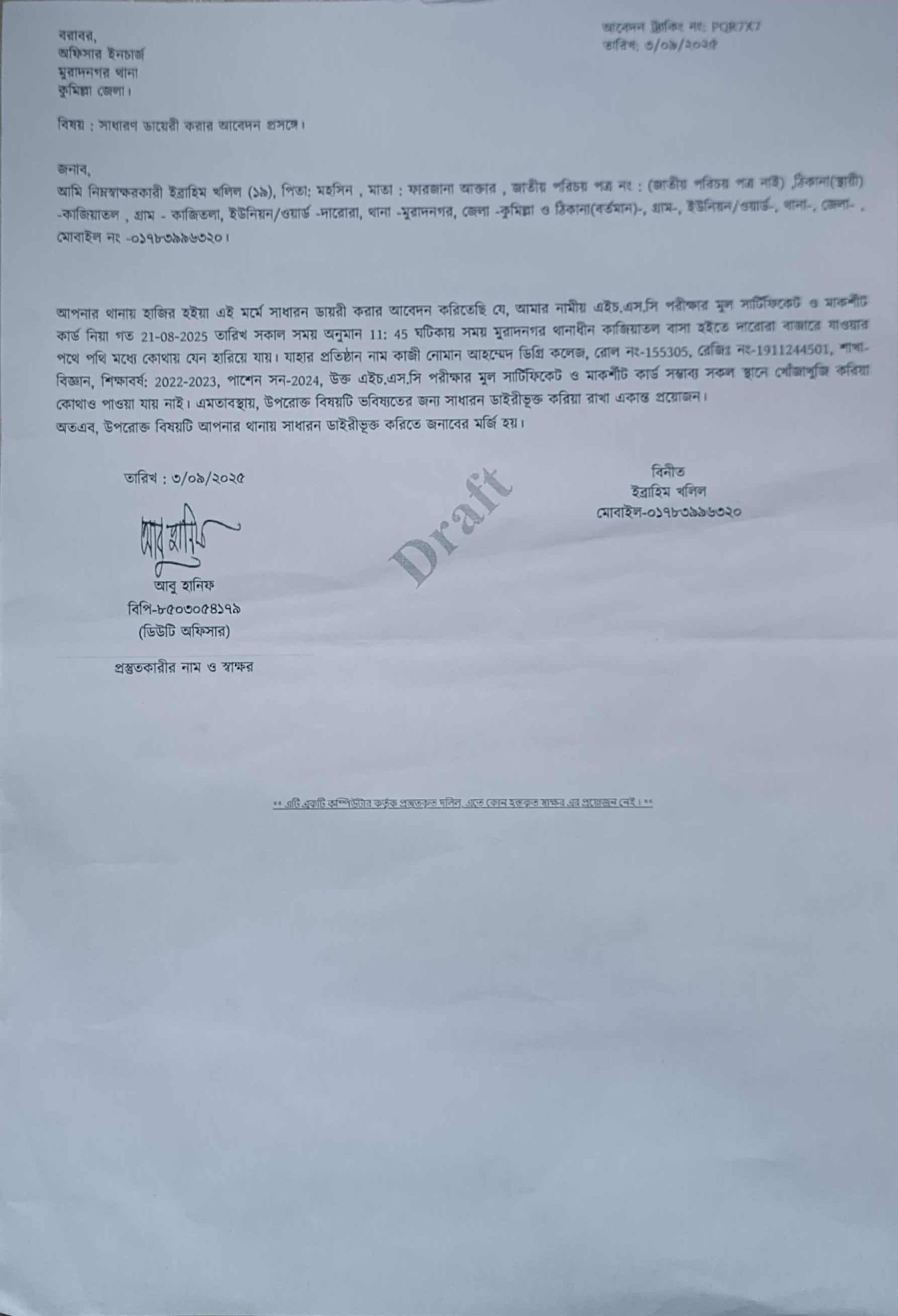 কুমিল্লার মুরাদনগর উপজেলার কাজিয়াল গ্রামের বাসিন্দা ও কাজী নোমান আহমেদ ডিগ্রি কলেজের শিক্ষার্থী খলিল তার এইচএসসি মূল সার্টিফিকেট হারিয়ে মারাত্মক বিপাকে পড়েছেন।