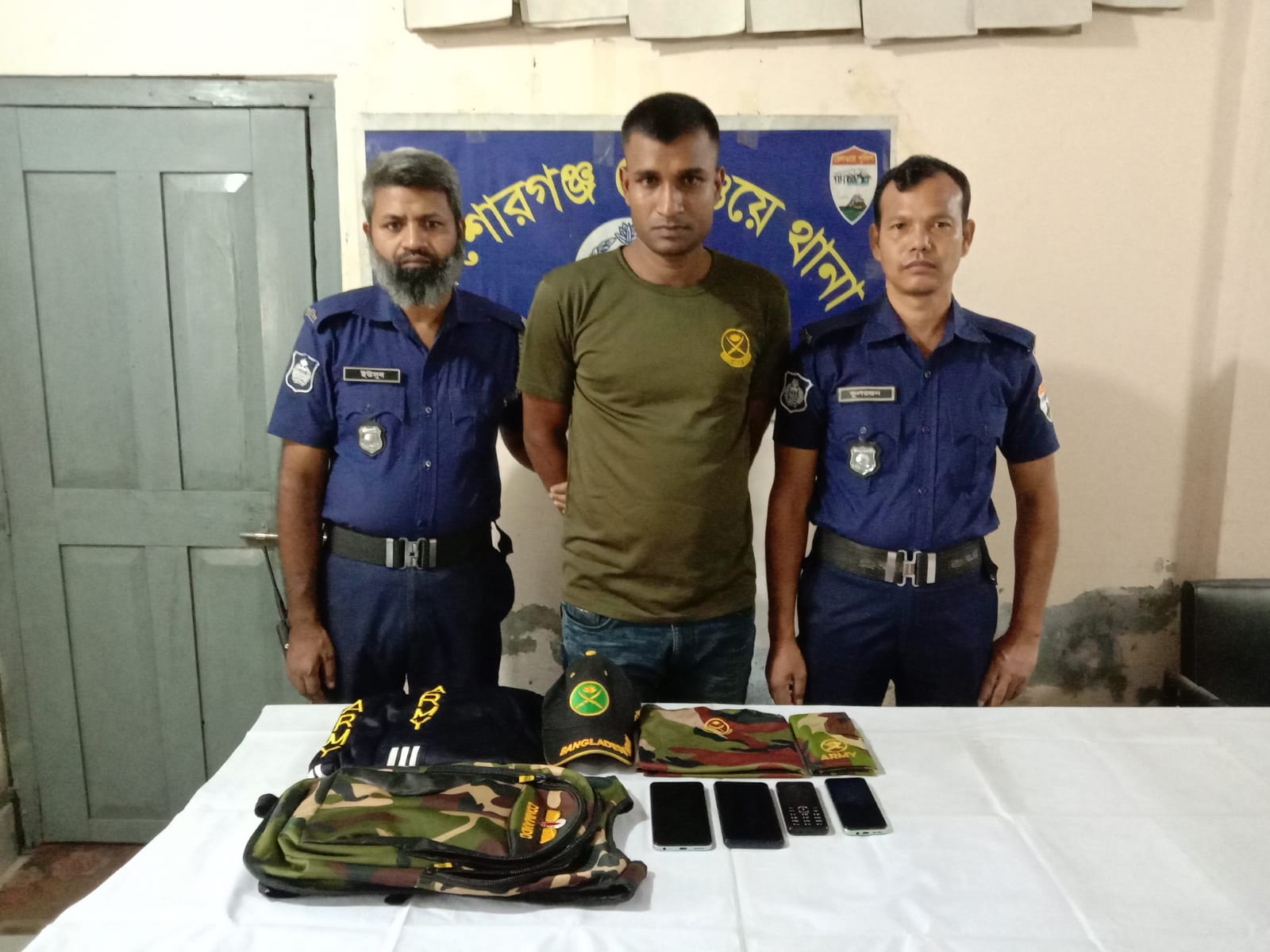 কিশোরগঞ্জ রেলওয়ে থানার পুলিশ সোমবার (২০ অক্টোবর) কিশোরগঞ্জ রেলওয়ে স্টেশনে মোঃ আলমগীর খাকে (৩৪) গ্রেফতার করেছে। তিনি ঢাকা থেকে আসা ৭৩৭ নং এগারোসিন্ধুর প্রভাতী ট্রেনে ভুয়া সেনা পরিচয় দিয়ে যাত্রীদের হুমকি প্রদান করেন।