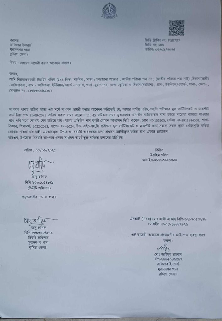 কোনো সহৃদয় ব্যক্তি যদি উক্ত এইচএসসি মূল সার্টিফিকেটটি পেয়ে থাকেন বা কোথাও খুঁজে পান, তবে অনুগ্রহপূর্বক তা খলিল মিয়া অথবা মুরাদনগর থানায় জমা দেওয়ার অনুরোধ জানানো যাচ্ছে।