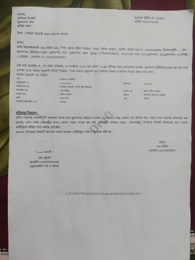 ঘটনাটি বুঝতে পেরে ফাহিম তৎক্ষণাৎ আশেপাশে খোঁজাখুঁজি করলেও মার্কশিটটি আর খুঁজে পাননি। পরবর্তীতে তিনি দ্রুত মুরাদনগর থানায় একটি সাধারণ ডায়েরি (জিডি) করেন, যাতে হারানো মার্কশিটটি উদ্ধারের জন্য প্রয়োজনীয় ব্যবস্থা নেওয়া যায়।